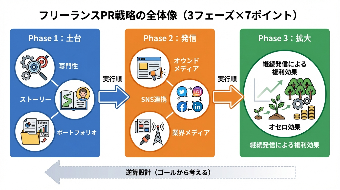 フリーランスのPRは、「第三者の言葉で専門性を証明する」行為です。本記事で解説した7つのポイントは、独立したテクニックではなく、土台→発信→拡大という3フェーズで連鎖する仕組みです。
