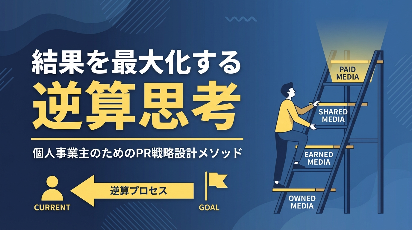 本記事では、個人事業主が実践できるPR戦略設計の全体像を解説します。「逆算思考」という考え方をベースに、目標メディアから現在地まで”台”を積み上げる方法、5つの戦略パターン、そして実行の3フェーズまで、明日から使える実務知識をお届けします。