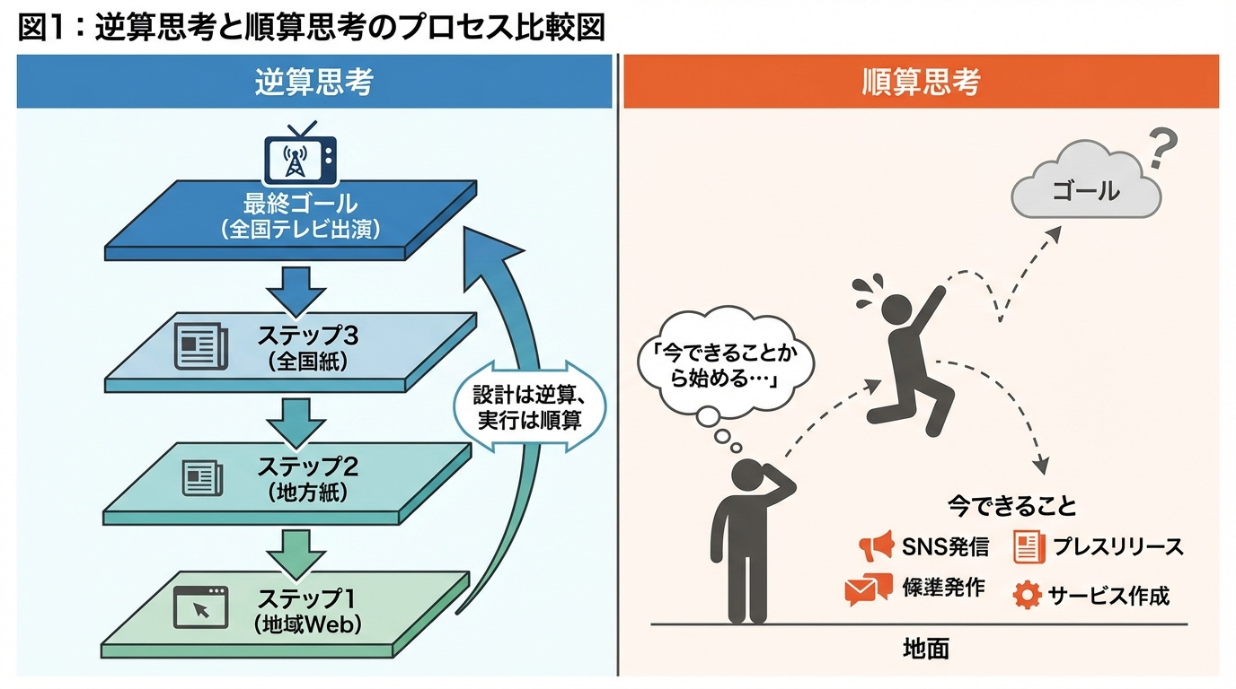 当編集部では、19年にわたるWEBマーケティング支援の実務経験と、数多くのメディア露出事例の分析を通じて、一つの結論に至りました──PR成功の鍵は「逆算思考」にある、と。